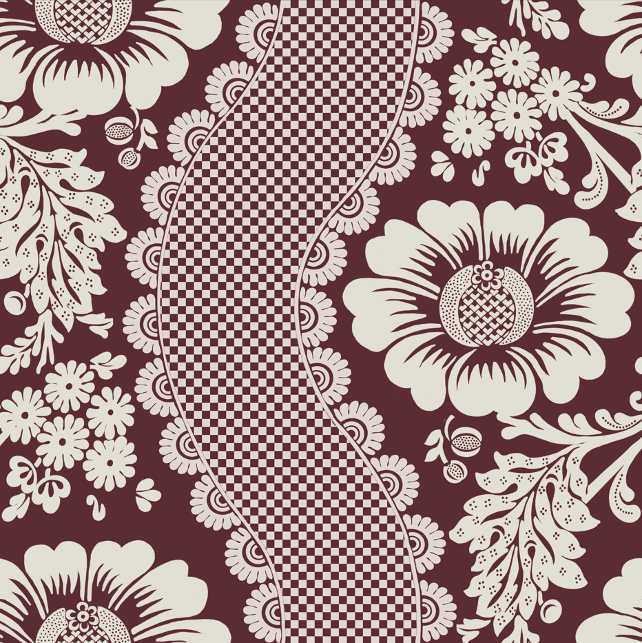 Un motif floral marron et crème avec de grandes fleurs et des branches feuillues. Une bande ondulée à carreaux traverse verticalement le centre, divisant les motifs floraux complexes de part et d'autre. la marque Toile de Jouy