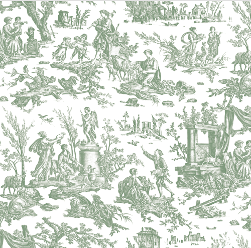 Une toile de Jouy détaillée en vert et blanc, représentant des scènes pastorales avec des personnes en vêtements d'époque, des enfants, des animaux, des arbres, des ruines classiques, et des détails naturels complexes tout au long de la pièce. la marque Toile de Jouy