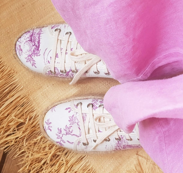 Composition : Toile de Jouy 100% coton, intérieur doublé 100% coton. Semelle en corde
