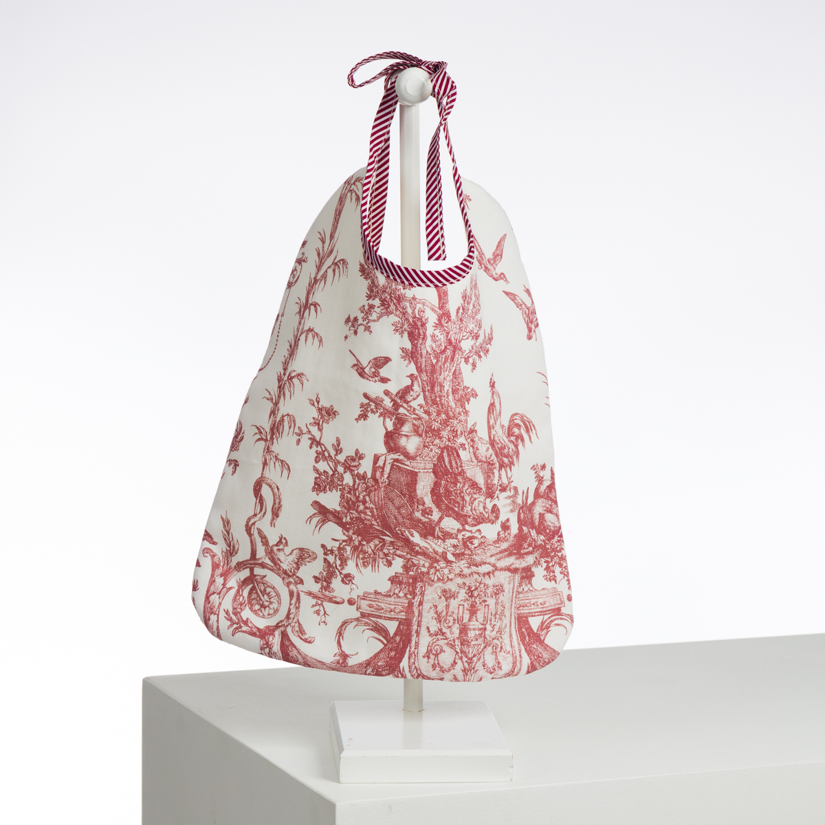 L’Escarpolette est l’un des motifs emblématiques de la Toile de Jouy ainsi que de la production et de la collaboration de Jean-Baptiste Huet pour la Manufacture Oberkampf. Représentant en partie centrale les joies de l’escarpolette, d’autres petites scènes complètent le motif, comme la fable ” le corbeau et le renard” et l’offrande à l’amour, dans un décor charmant de guirlandes florales et de putti. Dessinateur attitré de la Manufacture, Huet réalisa plus d’une trentaine de dessins, depuis les Travaux de la Manufacture en 1783 jusqu’à sa mort en 1811. Reçu à l’Académie en 1769 comme peintre d’animaux, thèmes que l’on retrouve de manière récurrente dans ses compositions, Huet aborde vers 1773 un nouveau genre, la pastorale. Caractéristique du deuxième type de composition d’Huet pour la Manufacture, les scènes galantes et la nature idéalisée de l’Escarpolette sont structurées par un décor d’arabesques, de guirlandes fleuries et de feuilles d’acanthes, à l’instar du Couronnement de la Rosière (vers 1785, N°inv.978.1.12), conservé dans les collections du musée de la Toile de Jouy, qui présente des similitudes stylistiques et iconographiques. Huet, s’inspirent des créations de son temps, comme le Hasard Heureux de l’Escarpolette de Jean-Honoré Fragonard (entre 1767-1769, Londres, Wallace Collection), témoignant de la capacité de la Manufacture Oberkampf, à s’inscrire dans le goût et l’esprit de son temps. Motif constitutif de l’identité de la Toile de Jouy en tant que style décoratif, l’Escarpolette est une source d’inspiration jusqu’au 20ème siècle : motif favori du couturier Christian Dior, il reprend ainsi le motif dans ses créations Haute Couture et décor ses boutiques de Toile de Jouy.