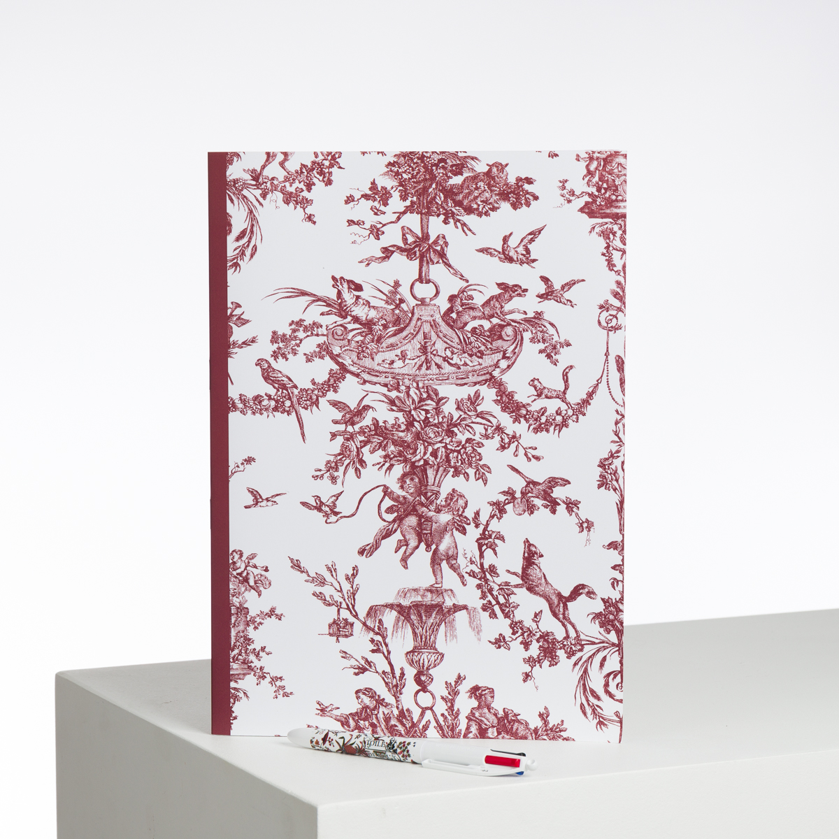 L’Escarpolette est l’un des motifs emblématiques de la Toile de Jouy ainsi que de la production et de la collaboration de Jean-Baptiste Huet pour la Manufacture Oberkampf. Représentant en partie centrale les joies de l’escarpolette, d’autres petites scènes complètent le motif, comme la fable ” le corbeau et le renard” et l’offrande à l’amour, dans un décor charmant de guirlandes florales et de putti. Dessinateur attitré de la Manufacture, Huet réalisa plus d’une trentaine de dessins, depuis les Travaux de la Manufacture en 1783 jusqu’à sa mort en 1811. Reçu à l’Académie en 1769 comme peintre d’animaux, thèmes que l’on retrouve de manière récurrente dans ses compositions, Huet aborde vers 1773 un nouveau genre, la pastorale. Caractéristique du deuxième type de composition d’Huet pour la Manufacture, les scènes galantes et la nature idéalisée de l’Escarpolette sont structurées par un décor d’arabesques, de guirlandes fleuries et de feuilles d’acanthes, à l’instar du Couronnement de la Rosière (vers 1785, N°inv.978.1.12), conservé dans les collections du musée de la Toile de Jouy, qui présente des similitudes stylistiques et iconographiques. Huet, s’inspirent des créations de son temps, comme le Hasard Heureux de l’Escarpolette de Jean-Honoré Fragonard (entre 1767-1769, Londres, Wallace Collection), témoignant de la capacité de la Manufacture Oberkampf, à s’inscrire dans le goût et l’esprit de son temps. Motif constitutif de l’identité de la Toile de Jouy en tant que style décoratif, l’Escarpolette est une source d’inspiration jusqu’au 20ème siècle : motif favori du couturier Christian Dior, il reprend ainsi le motif dans ses créations Haute Couture et décor ses boutiques de Toile de Jouy.