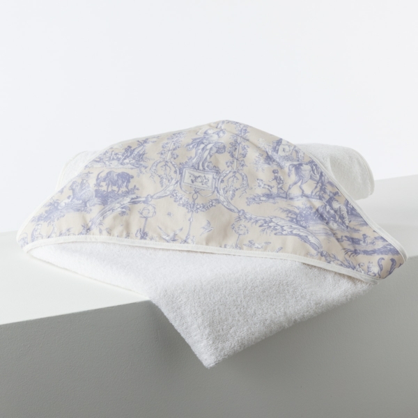 Cape de bain en éponge, doublée d’une capuche en toile de Jouy.