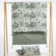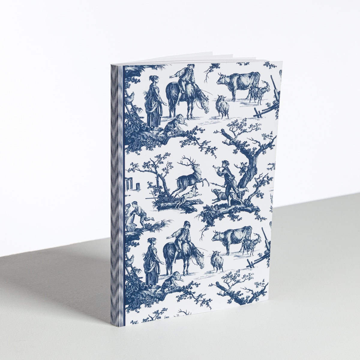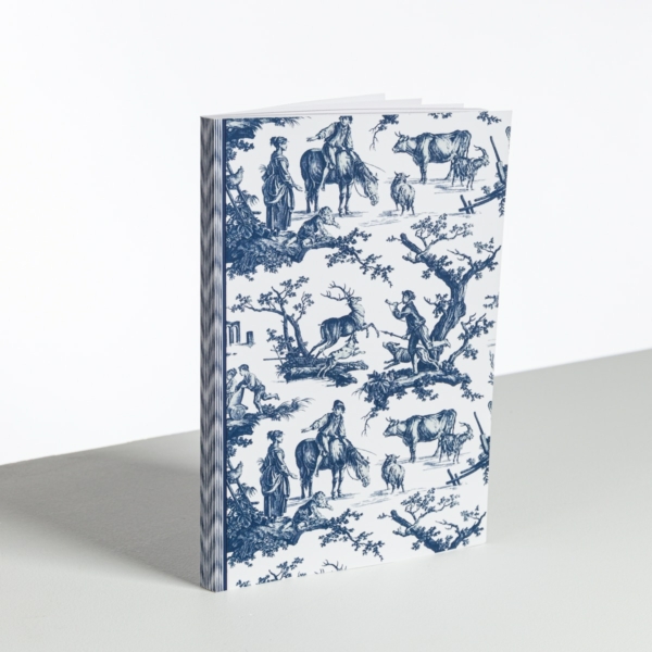 Le motif Les Plaisirs de la campagne élaboré par Jean-Baptiste Huet en 1802 pour la Manufacture Oberkampf se vend à l’origine sous le titre commercial La petite chasse. Toutefois, il est rapidement identifié sous un nouveau titre puisque la chasse est peu présente dans le dessin, qui comporte plutôt des scènes de vie paysanne et des saynètes champêtres. Dernière pastorale réalisée par l’artiste pour la production de Jouy, on perçoit le goût de l’antique qui est à la mode dans les arts décoratifs. Ici, ce sont les ruines qui sont utilisées comme décor. Au tournant du XIXe siècle, l’esthétique de la ruine ajoute à l’idéalisation nostalgique et pittoresque des campagnes. Elles accentuent l’effet de douce langueur déjà évoquée avec le motif du bateau et des animaux qui paissent.