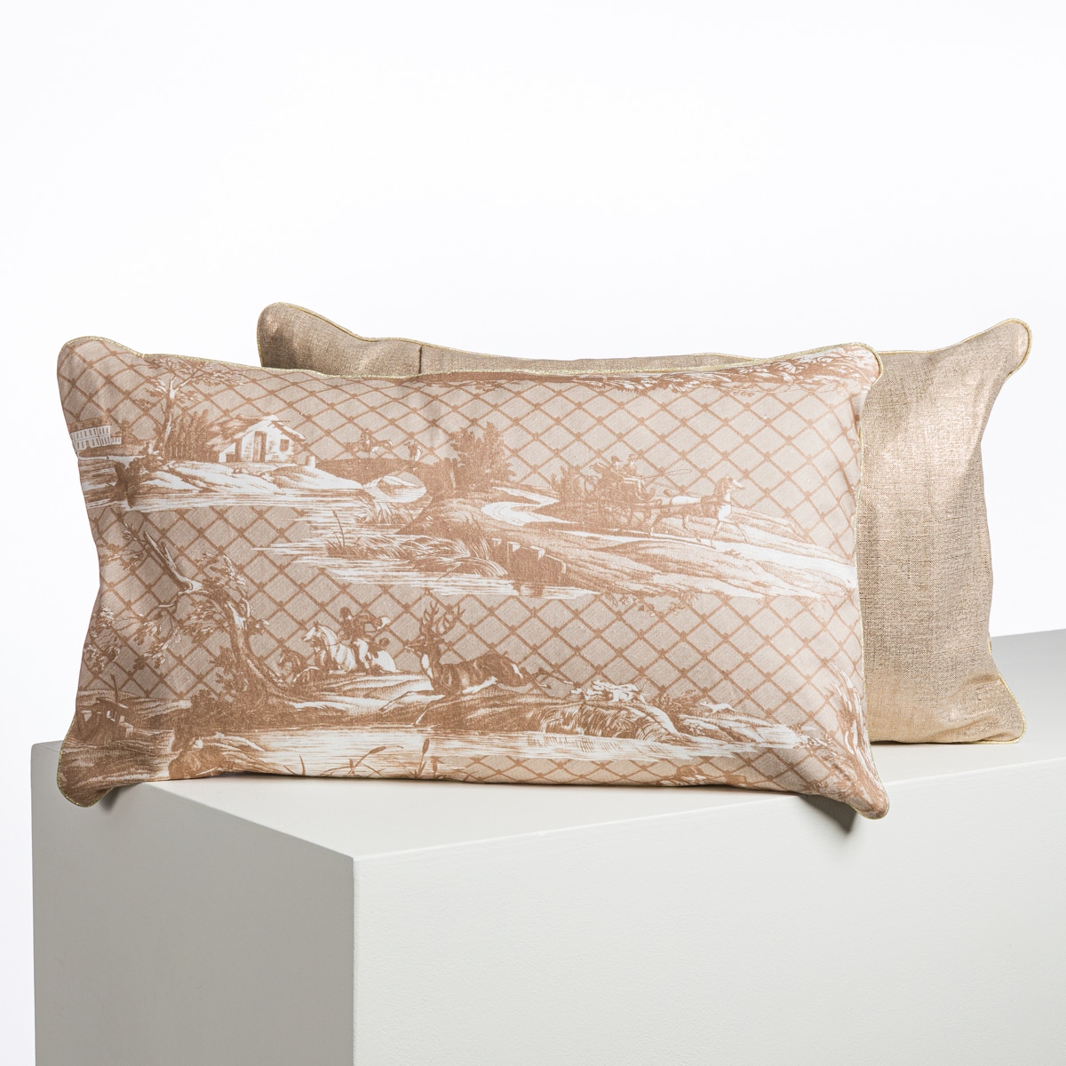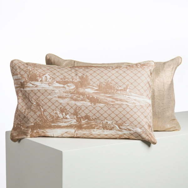 Elaboré par Horace Vernet, célèbre peintre et créateur du 19ème siècle, la chasse à Jouy se déroule au cœur de la vallée jovacienne, berceau de la Toile de Jouy, fondé en 1760 par Christophe-Philippe Oberkampf. Grâce à la technique de l’impression à la plaque de cuivre, de nombreux détails sont représentés, tel que le grand château de Jouy, la rivière de la Bièvre ainsi que la mention « Route de Jouy » sur un poteau indicateur. De plus pour la première fois, le nom des trois acteurs de la toile apparait : l’artiste, le graveur et le fabricant.