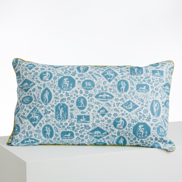 Dès le Moyen-Age, puis durant la Renaissance, les artistes puisent leur inspiration dans le style de l’Antiquité classique. A la suite des découvertes d’Herculanum en 1738 et de Pompéi en 1748, un véritable engouement se développe pour les fouilles et l’étude des monuments anciens, donnant naissance au mouvement néoclassique dans la seconde moitié du 18ème siècle, théorisé par Winckelmann. Sous le règne de Louis XV, de nombreux amateurs collectionnent ainsi des objets avec des motifs d’inspiration mythologique ou des copies d’antiques, dont la marquise de Pompadour. Oberkampf, sensible aux tendances artistiques de son temps, imprime des toiles à sujet mythologique, comme les Camées à la fin du 18ème siècle. Le motif est composé de 16 petits médaillons représentant des animaux ou des figures antiques sur un fond crème, parsemé de fleurs et de feuillages naturalistes. De formes diverses, ils évoquent les camées, petites pierres composées de différentes couches de plusieurs couleurs superposées et sculptées en relief, très en vogue à la période antique.