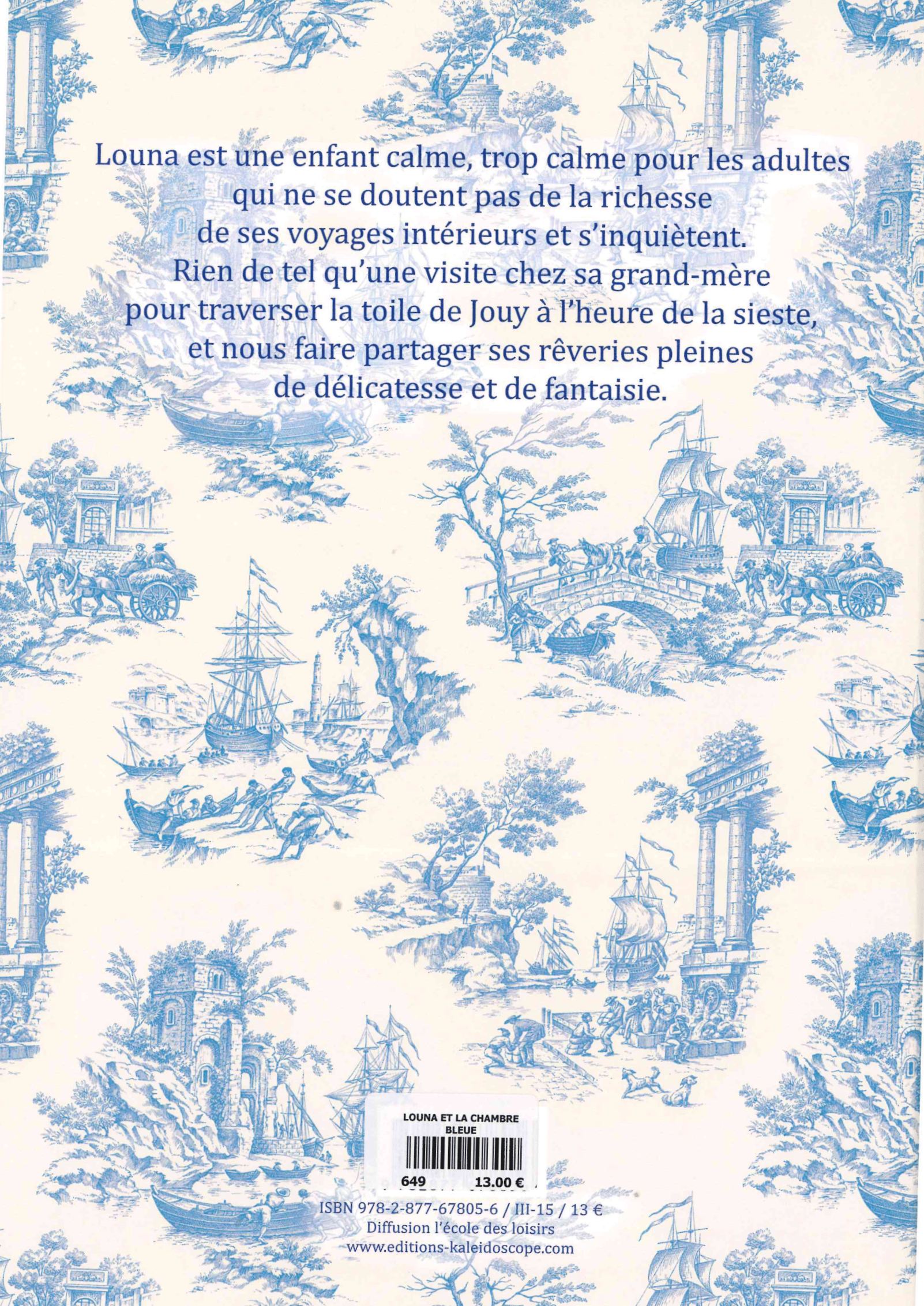 “Louna est une enfant calme, trop calme pour les adultes qui ne se doutent pas de la richesse de ses voyages intérieurs et s’inquiètent. Rien de tel qu’une visite chez sa grand-mère pour traverser la Toile de Jouy à l’heure de la sieste, et nous faire partager ses rêveries pleines de délicatesse et de fantaisie.”