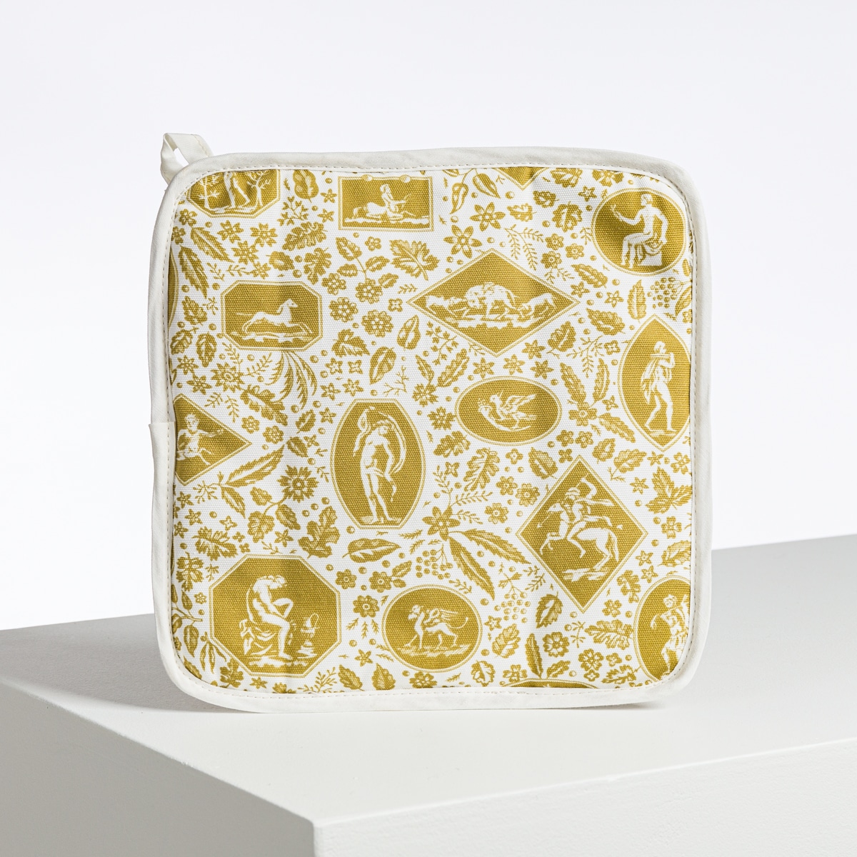 Dès le Moyen-Age, puis durant la Renaissance, les artistes puisent leur inspiration dans le style de l’Antiquité classique. A la suite des découvertes d’Herculanum en 1738 et de Pompéi en 1748, un véritable engouement se développe pour les fouilles et l’étude des monuments anciens, donnant naissance au mouvement néoclassique dans la seconde moitié du 18ème siècle, théorisé par Winckelmann. Sous le règne de Louis XV, de nombreux amateurs collectionnent ainsi des objets avec des motifs d’inspiration mythologique ou des copies d’antiques, dont la marquise de Pompadour. Oberkampf, sensible aux tendances artistiques de son temps, imprime des toiles à sujet mythologique, comme les Camées à la fin du 18ème siècle. Le motif est composé de 16 petits médaillons représentant des animaux ou des figures antiques sur un fond crème, parsemé de fleurs et de feuillages naturalistes. De formes diverses, ils évoquent les camées, petites pierres composées de différentes couches de plusieurs couleurs superposées et sculptées en relief, très en vogue à la période antique.