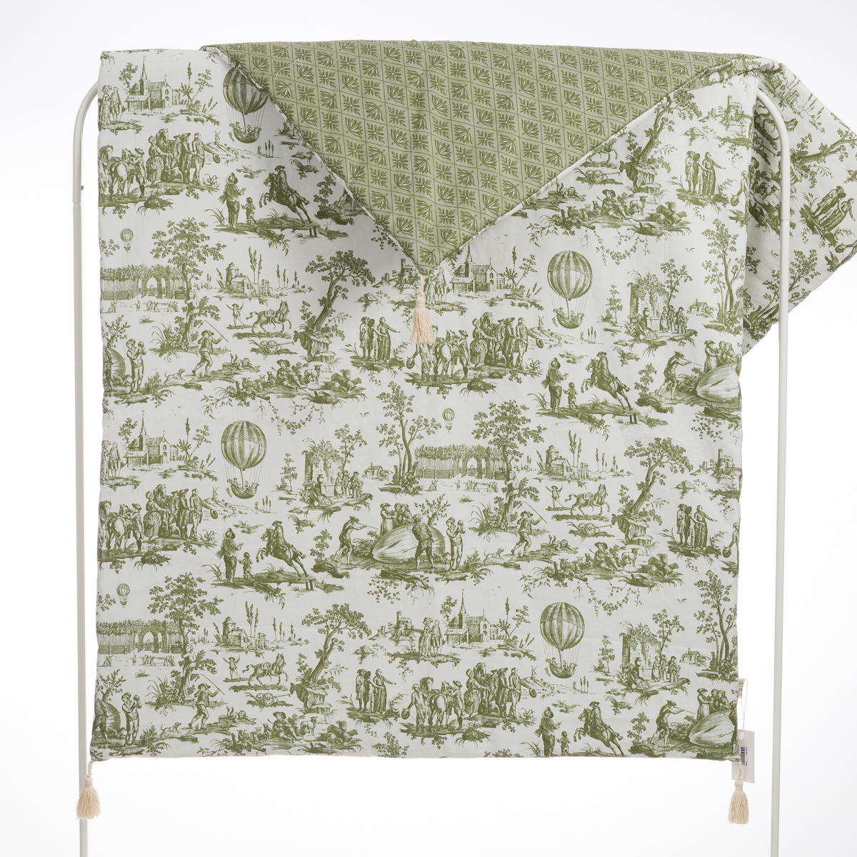 Dans la seconde moitié du 18ème siècle se multiplient journaux, gazettes et revues qui diffusent à l’intention des classes aisées l’information sur l’actualité dans différents domaines. Cette actualité retentissante se retrouvent également sur les toiles imprimées et participent à la diversité des productions et donc au succès de la Manufacture de Jouy. Oberkampf fait représenter par exemple un fait historique devenu un phénomène de mode dans les arts décoratifs : les premières ascensions en ballon. L’évènement du Ballon de Gonesse, parti du Champs-de-Mars et qui s’écrase à Gonesse le 27 août 1783 est imprimé dans les mois qui suivent par la Manufacture. Cette toile de Jouy est bien plus qu’un simple motif décoratif, c’est un véritable témoignage de l’époque, qui illustre l’intérêt des Français pour les nouvelles technologies et leur fascination pour le ciel.