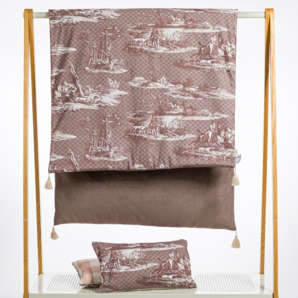 Elaboré par Horace Vernet, célèbre peintre et créateur du 19ème siècle, la chasse à Jouy se déroule au cœur de la vallée jovacienne, berceau de la Toile de Jouy, fondé en 1760 par Christophe-Philippe Oberkampf. Grâce à la technique de l’impression à la plaque de cuivre, de nombreux détails sont représentés, tel que le grand château de Jouy, la rivière de la Bièvre ainsi que la mention « Route de Jouy » sur un poteau indicateur. De plus pour la première fois, le nom des trois acteurs de la toile apparait : l’artiste, le graveur et le fabricant.