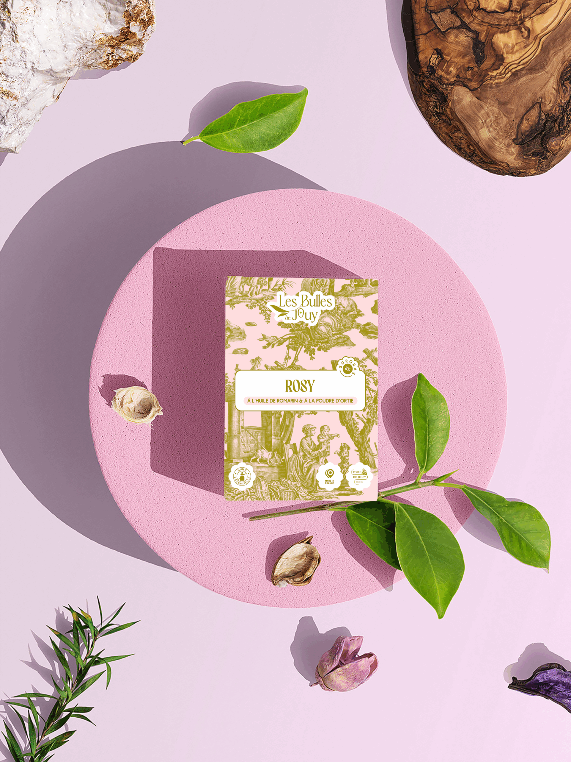 Poudre d’orties : riche en minéraux, reconnue pour son action revitalisante et purifiante sur la peau. Elle apporte une légère texture au savon.