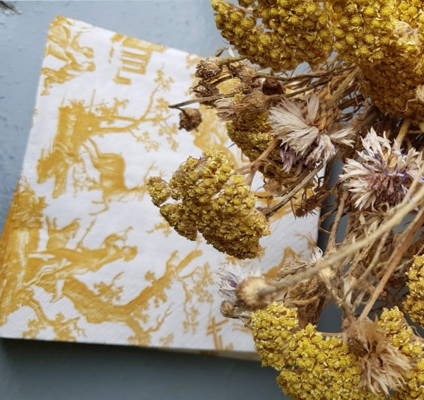 Le motif Les Plaisirs de la campagne élaboré par Jean-Baptiste Huet en 1802 pour la Manufacture Oberkampf se vend à l’origine sous le titre commercial La petite chasse. Toutefois, il est rapidement identifié sous un nouveau titre puisque la chasse est peu présente dans le dessin, qui comporte plutôt des scènes de vie paysanne et des saynètes champêtres. Dernière pastorale réalisée par l’artiste pour la production de Jouy, on perçoit le goût de l’antique qui est à la mode dans les arts décoratifs. Ici, ce sont les ruines qui sont utilisées comme décor. Au tournant du XIXe siècle, l’esthétique de la ruine ajoute à l’idéalisation nostalgique et pittoresque des campagnes. Elles accentuent l’effet de douce langueur déjà évoquée avec le motif du bateau et des animaux qui paissent.