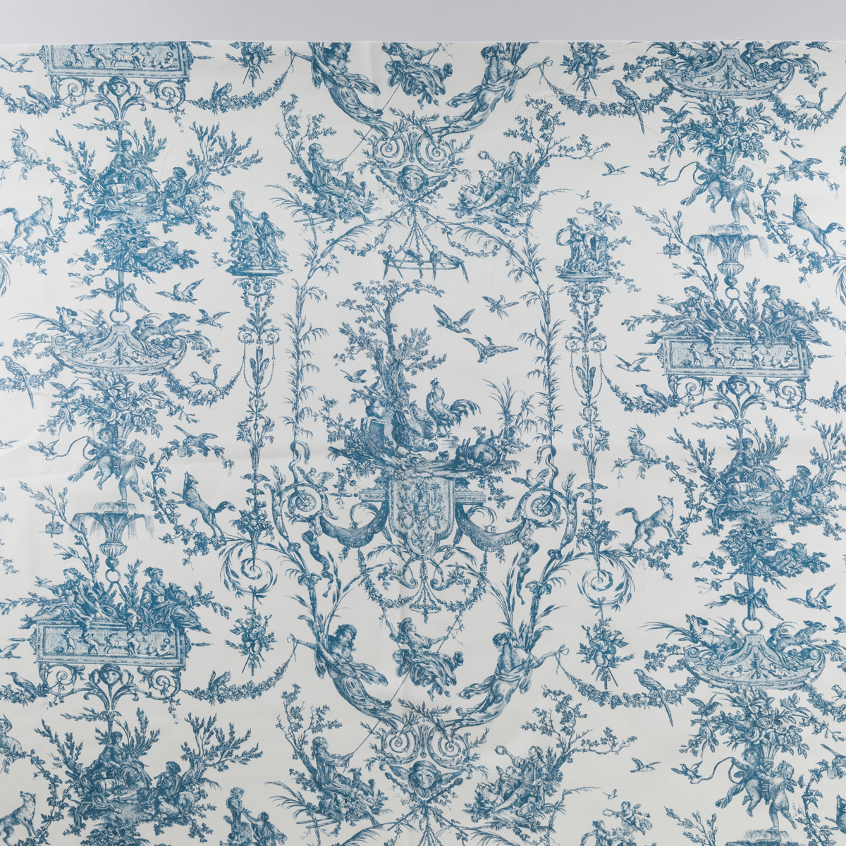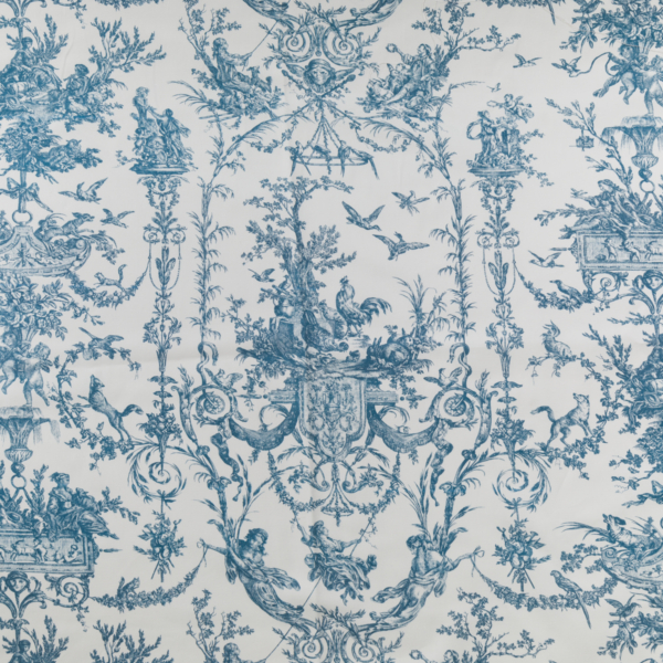 L’Escarpolette est l’un des motifs emblématiques de la Toile de Jouy ainsi que de la production et de la collaboration de Jean-Baptiste Huet pour la Manufacture Oberkampf. Représentant en partie centrale les joies de l’escarpolette[1], d’autres petites scènes complètent le motif, comme la fable ” le corbeau et le renard” et l’offrande à l’amour, dans un décor charmant de guirlandes florales et de putti. Dessinateur attitré de la Manufacture, Huet réalisa plus d’une trentaine de dessins, depuis les Travaux de la Manufacture en 1783 jusqu’à sa mort en 1811. Reçu à l’Académie en 1769 comme peintre d’animaux, thèmes que l’on retrouve de manière récurrente dans ses compositions, Huet aborde vers 1773 un nouveau genre, la pastorale. Caractéristique du deuxième type de composition d’Huet pour la Manufacture, les scènes galantes et la nature idéalisée de l’Escarpolette sont structurées par un décor d’arabesques, de guirlandes fleuries et de feuilles d’acanthes, à l’instar du Couronnement de la Rosière (vers 1785, N°inv.978.1.12), conservé dans les collections du musée de la Toile de Jouy, qui présente des similitudes stylistiques et iconographiques. Huet, s’inspirent des créations de son temps, comme le Hasard Heureux de l’Escarpolette de Jean-Honoré Fragonard (entre 1767-1769, Londres, Wallace Collection), témoignant de la capacité de la Manufacture Oberkampf, à s’inscrire dans le goût et l’esprit de son temps. Motif constitutif de l’identité de la Toile de Jouy en tant que style décoratif, l’Escarpolette est une source d’inspiration jusqu’au 20ème siècle : motif favori du couturier Christian Dior, il reprend ainsi le motif dans ses créations Haute Couture et décor ses boutiques de Toile de Jouy.