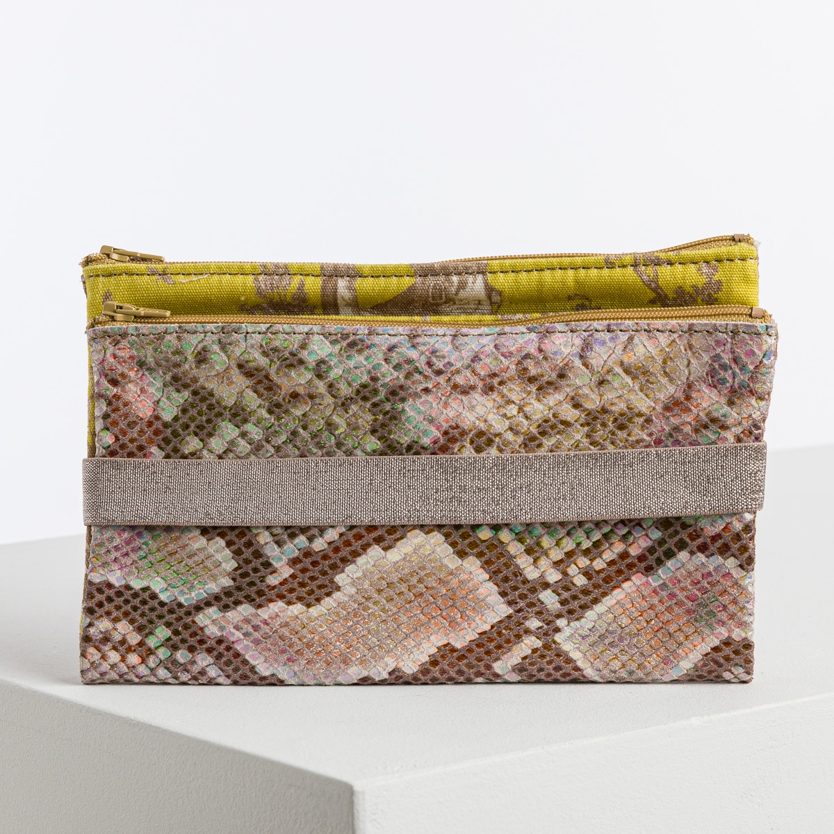 Deux poches zippées solidaires, maintenues ensemble par une bande élastique.