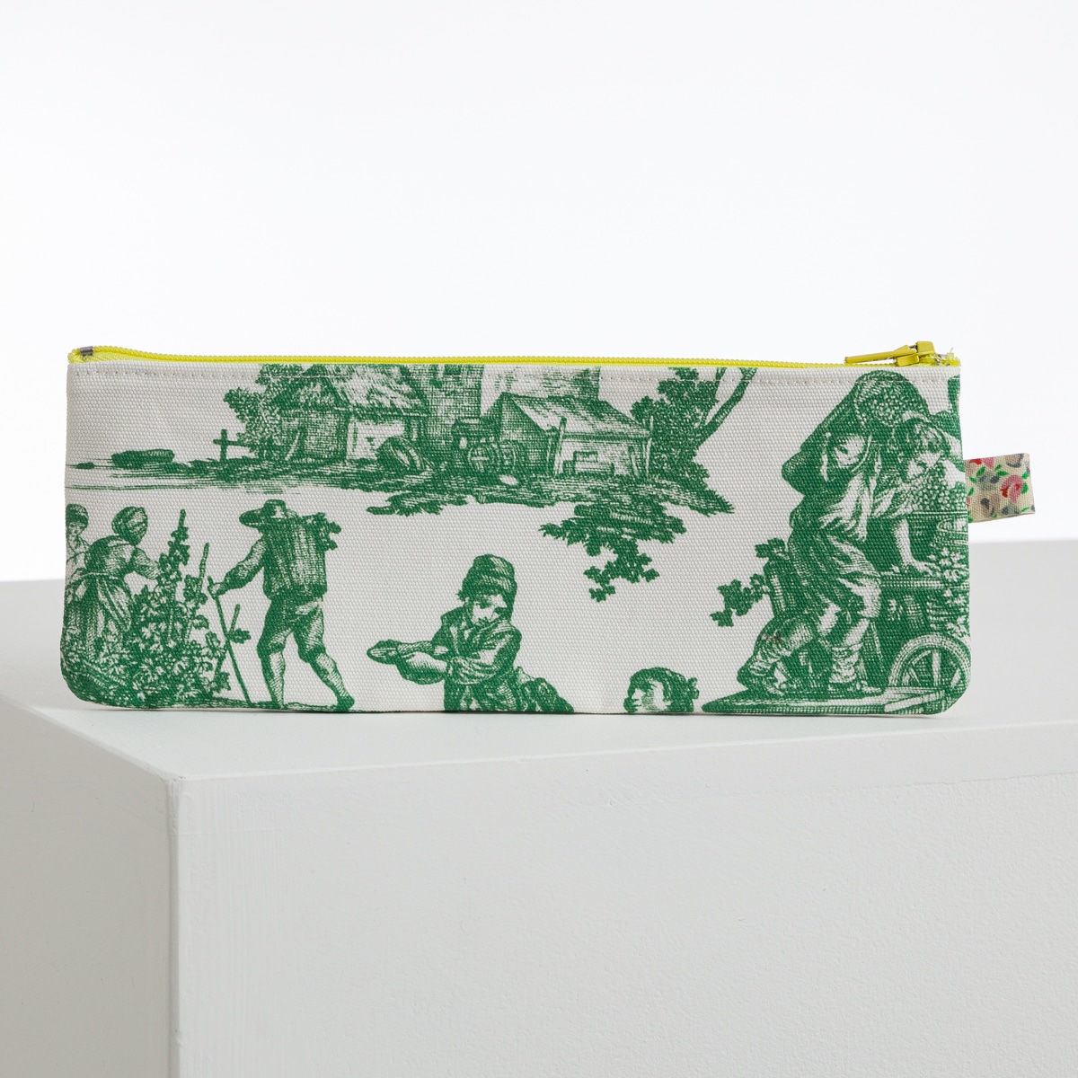 Dessinateur attitré de la Manufacture Oberkampf depuis 1783, Jean-Baptiste Huet élabore cette pastorale en 1787. Les scènes des Délices des quatre saisons évoquent les travaux agraires ou les jeux d’extérieur propres à chaque saison : la danse autour de l’arbre de mai représente le printemps ; la récolte du blé et une scène de pique-nique, l’été ; les vendanges, l’automne ; un traîneau glissant sur la neige et des patineurs, la saison hivernale. Les traits vifs du dessin et l’organisation des saynètes, reliées entre elles par des feuillages et des branchages, donnent l’illusion d’un mouvement sans fin, en écho au cycle infini des saisons. Homme du siècle des Lumières, questionné par le rapport de l’homme à la nature, Jean-Baptiste Huet propose avec Les Délices des quatre saisons une vision bucolique d’une nature abondante et prospère, rappelant les thèmes chers aux auteurs antiques tels que Virgile dans L’Arcadie et Ovide dans Les Métamorphoses.